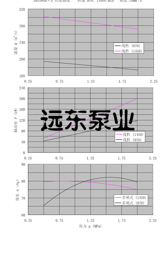 3GS160D*3三螺桿泵轉(zhuǎn)速970,1450r/min,粘度75cst性能曲線圖